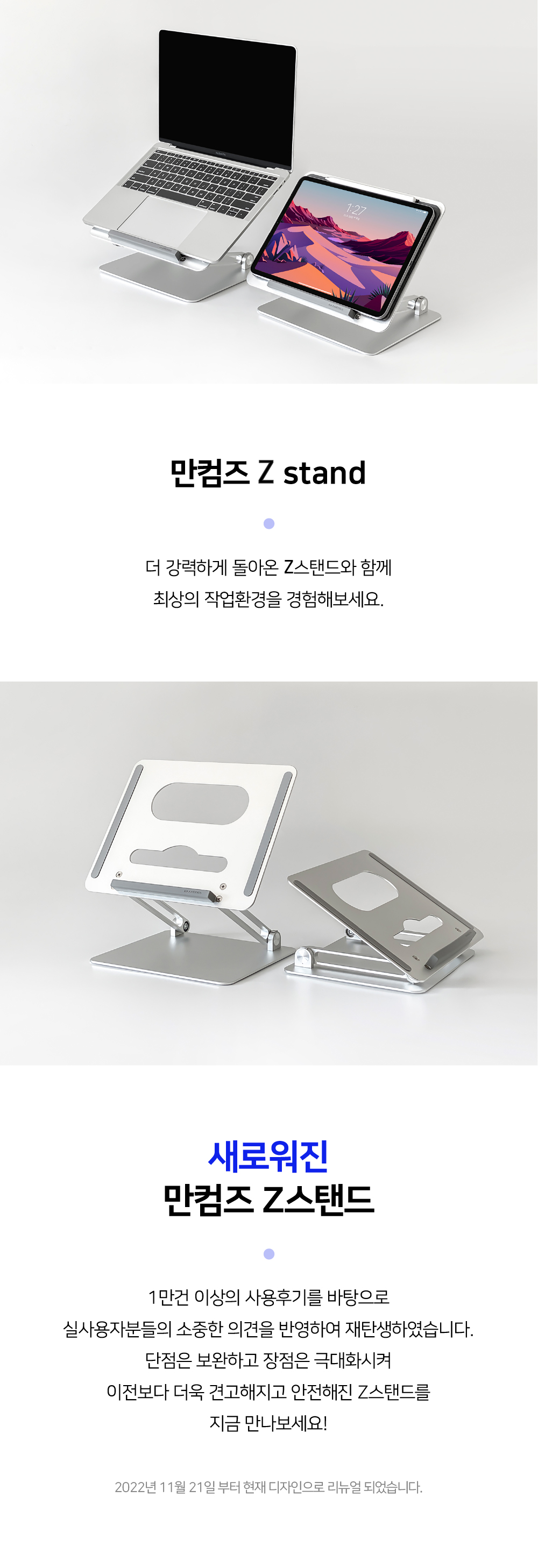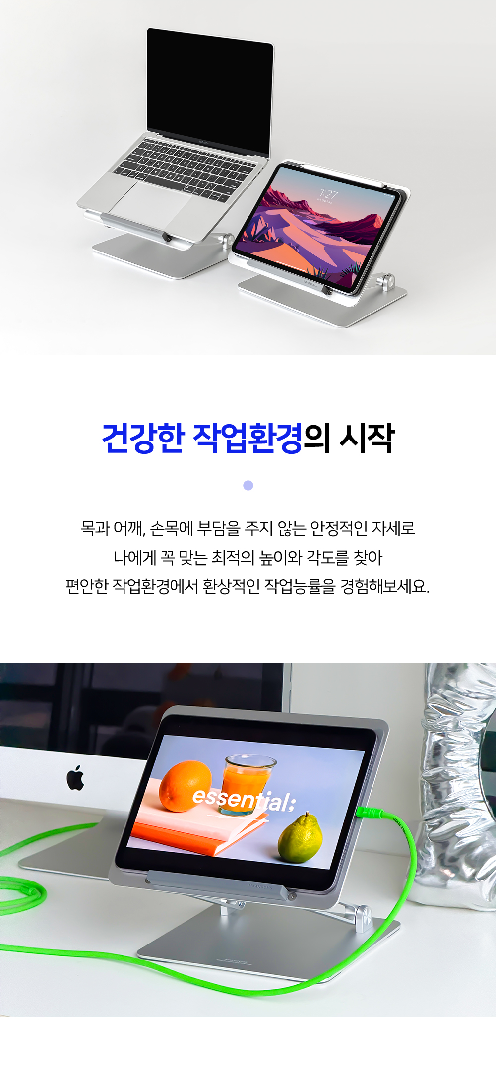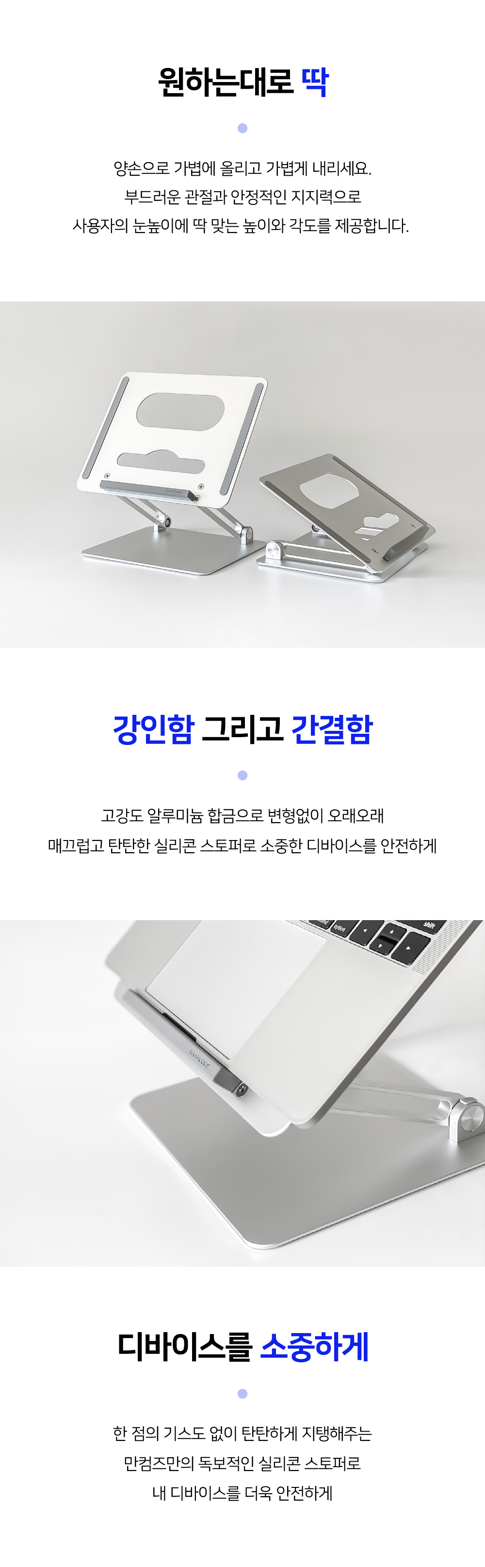 누적판매 60,000건에 빛나는 국민 노트북거치대높이와 각도 모두 자유롭게 조절되는 폴딩형 스탠드로노트북은 물론 각종 태블릿PC를 내 눈높이에 딱맞게 조절해편안한 자세와 안정적인 작업환경을 제공합니다.