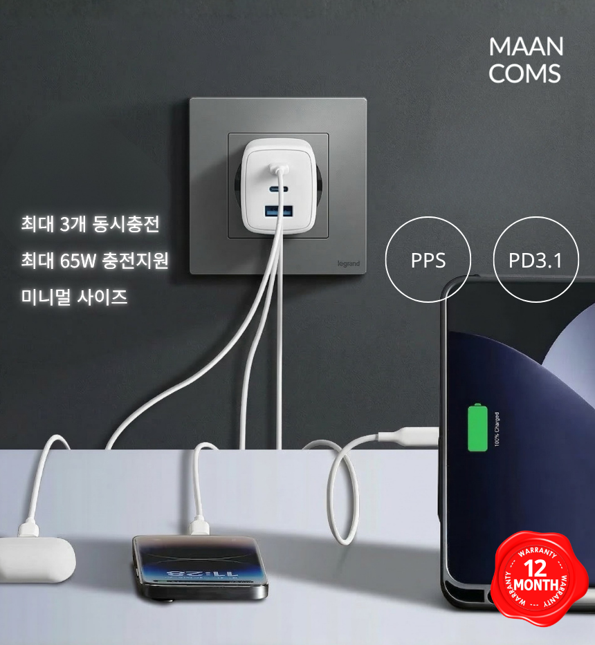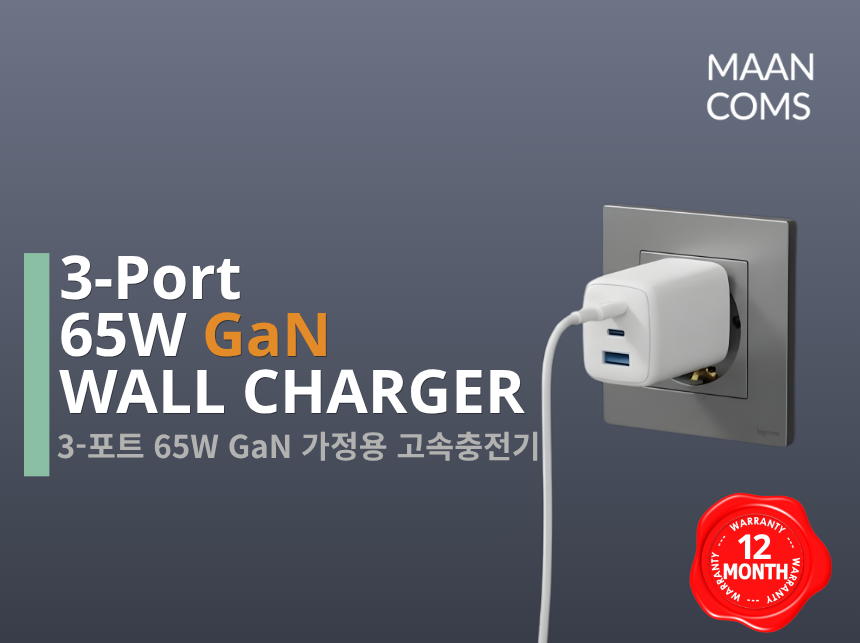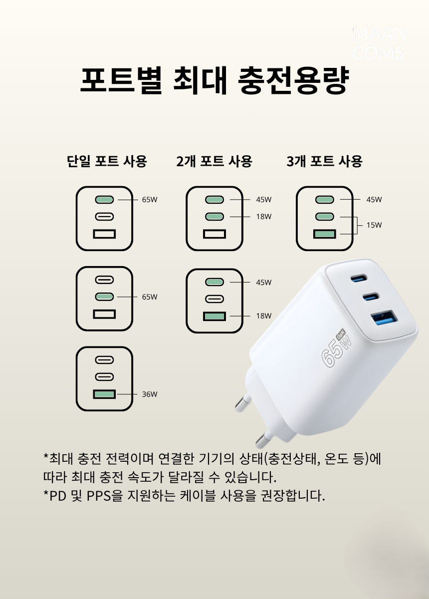 최신 GaN칩을 사용한 최대 65W 출력을 지원하는 고속충전기입니다.