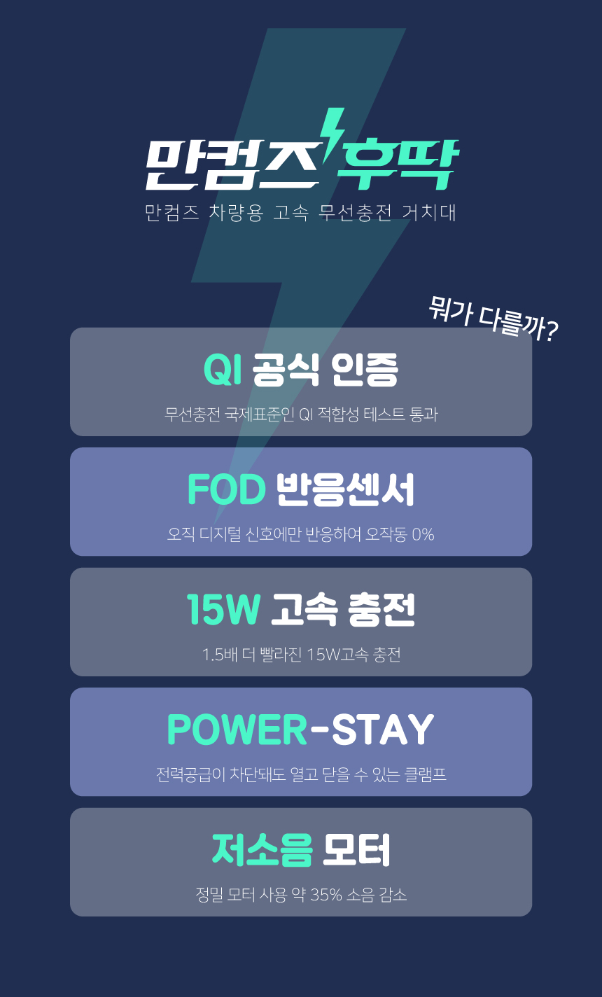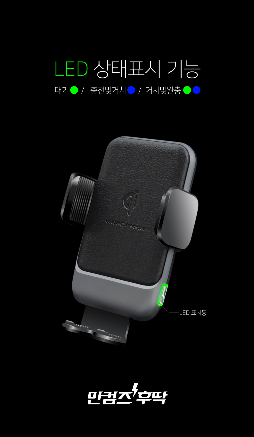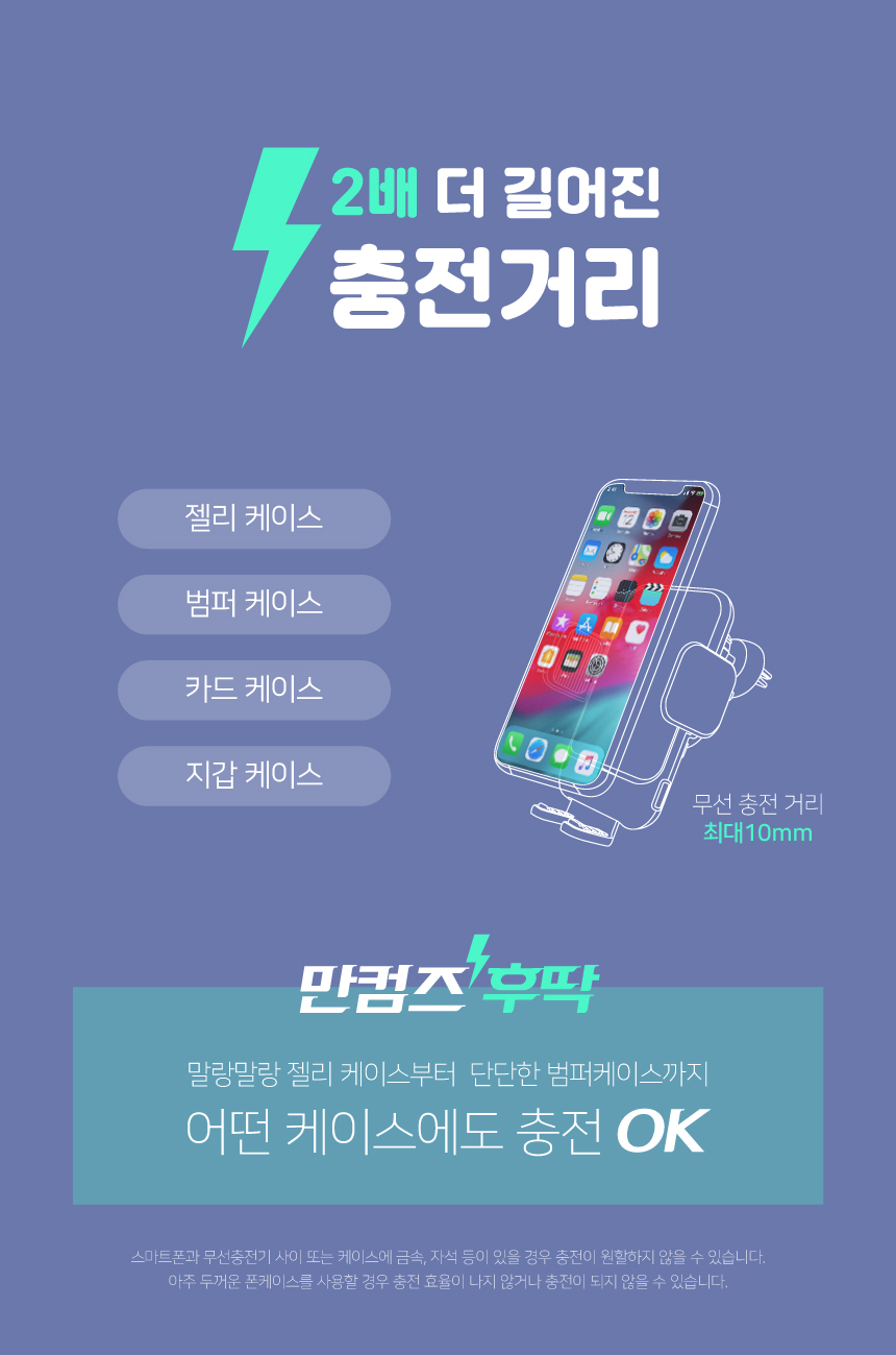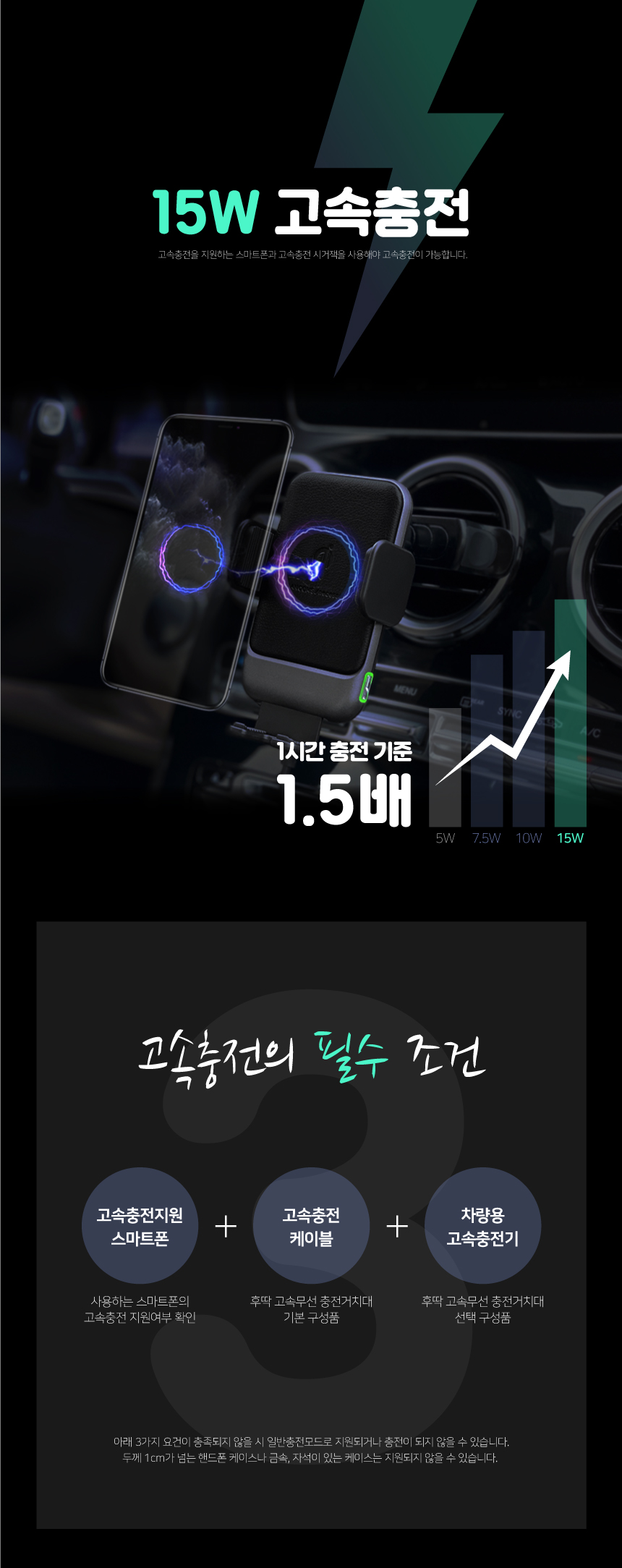 15W 고속충전으로 운전중에도 후딱 충전!저소음모터와 FOD반응 센서, 다양한 거치타입 지원으로내 차에 꼭 맞게 후딱 고속충전